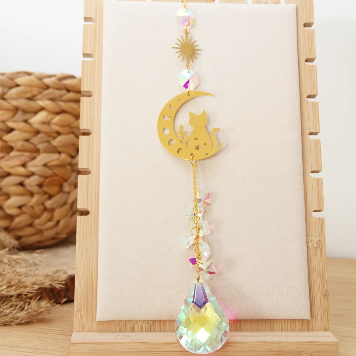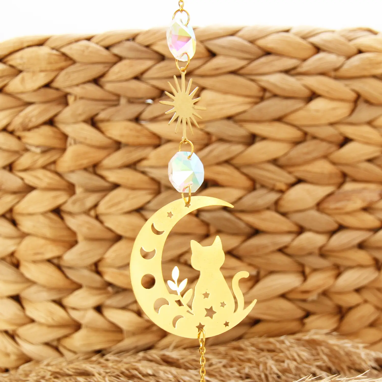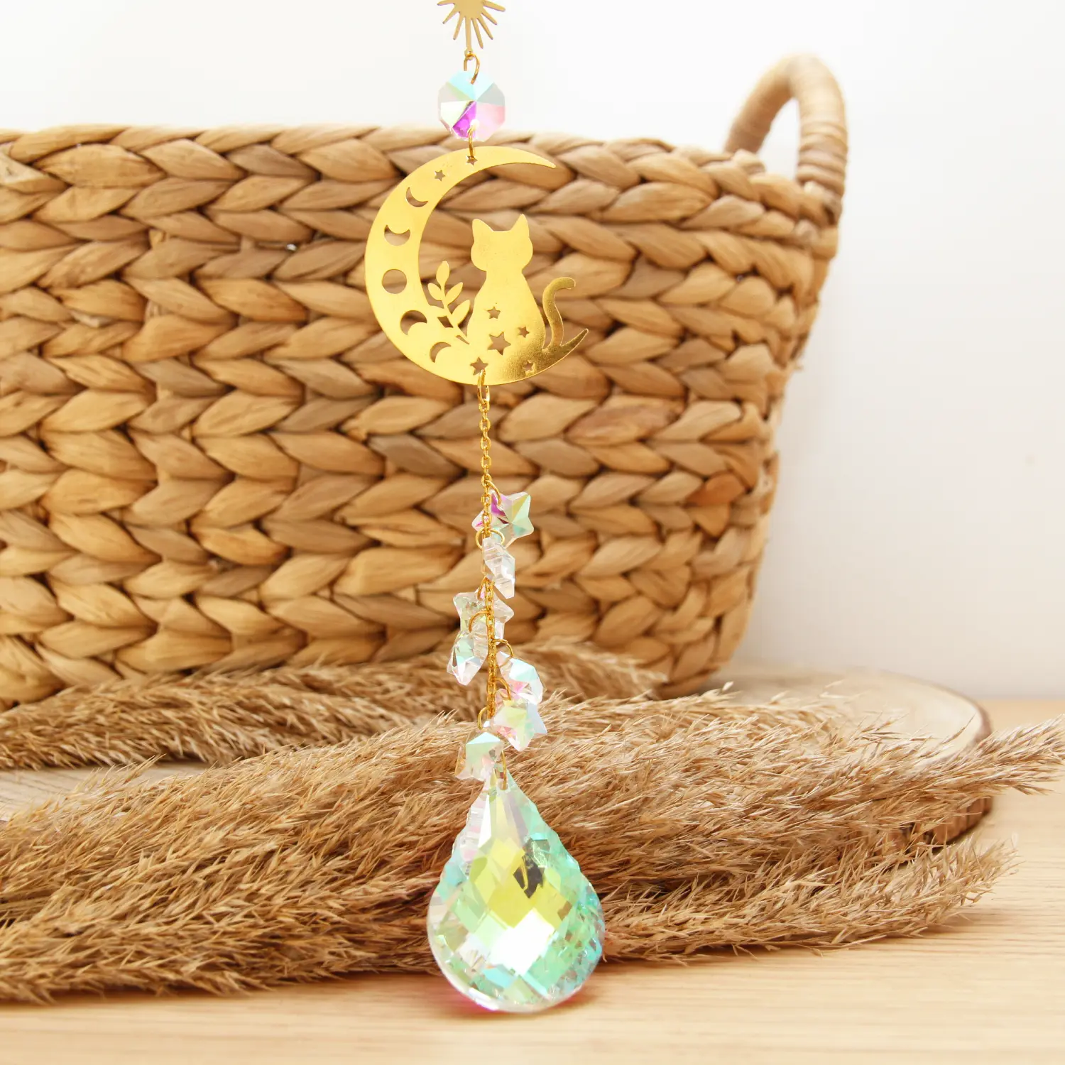 Transformez votre intérieur en un spectacle de lumière avec notre attrape-soleil en forme de chat. Ce capteur de lumière artisanal combine des cristaux scintillants et des accessoires métalliques pour créer de magnifiques arcs-en-ciel dès que le soleil l’effleure. Un objet décoratif aussi charmant qu’apaisant qui apportera une touche de magie à votre quotidien.