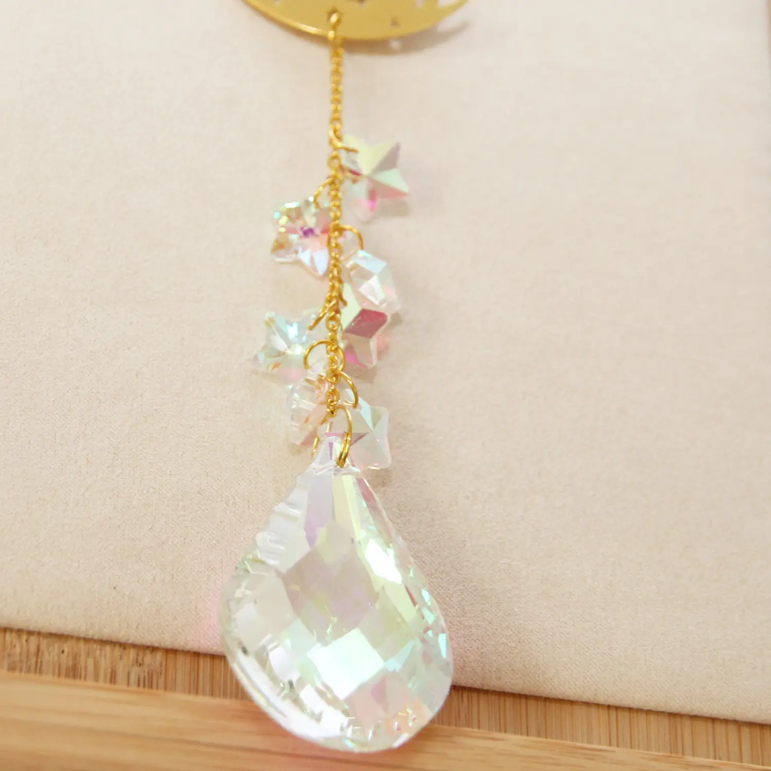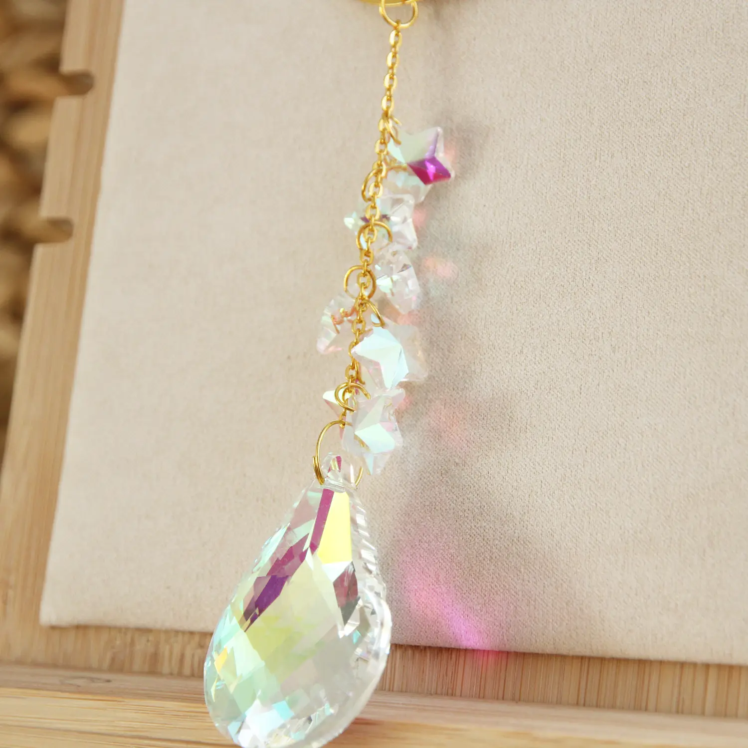 Suspendez ce capteur de soleil près d’une fenêtre, près d’une baie vitrée, et laissez-vous émerveiller par le ballet de couleurs qu’il projette. Les prismes naturels des cristaux démultiplient chaque rayon de lumière, créant une atmosphère enchantée qui change selon l’heure et l’intensité du soleil.